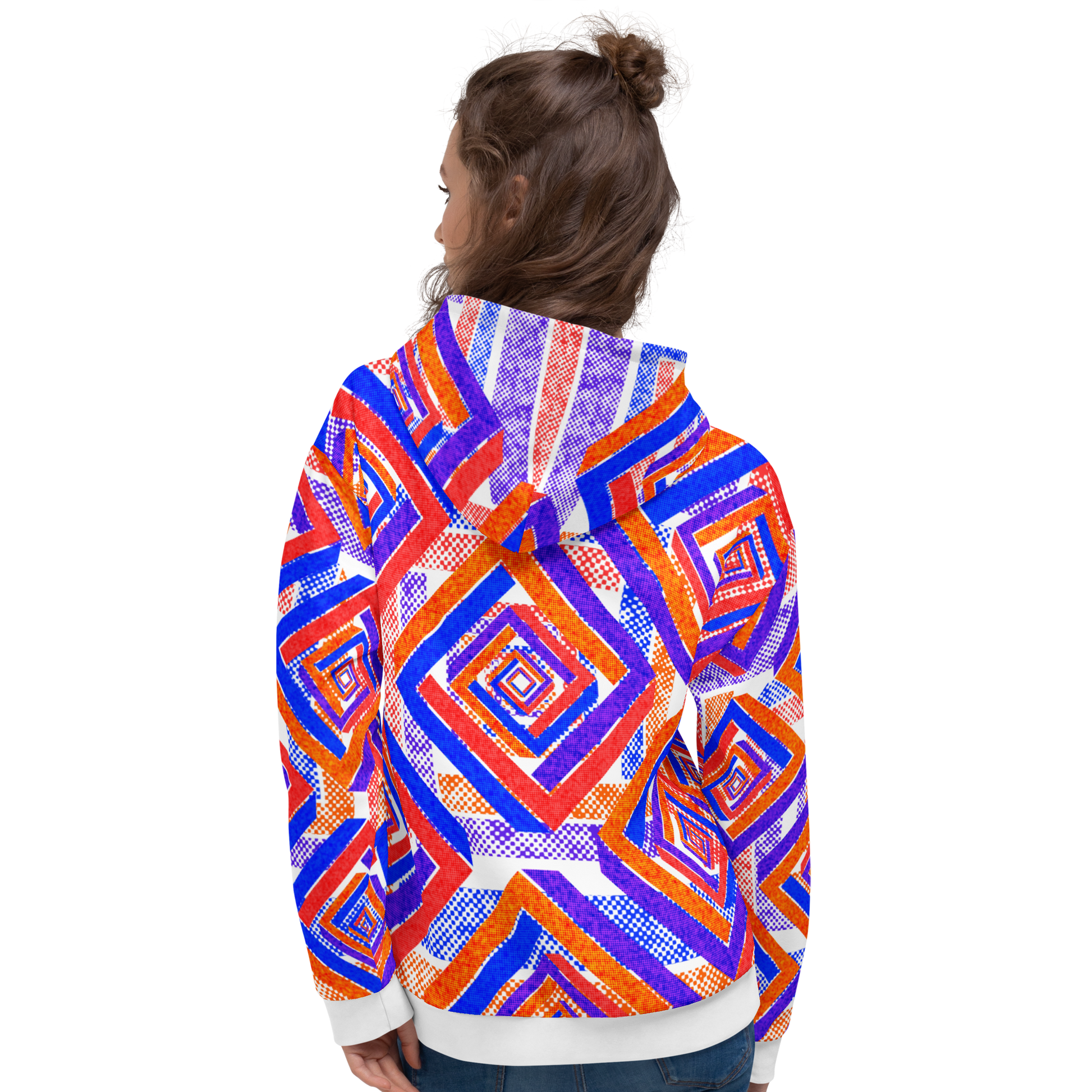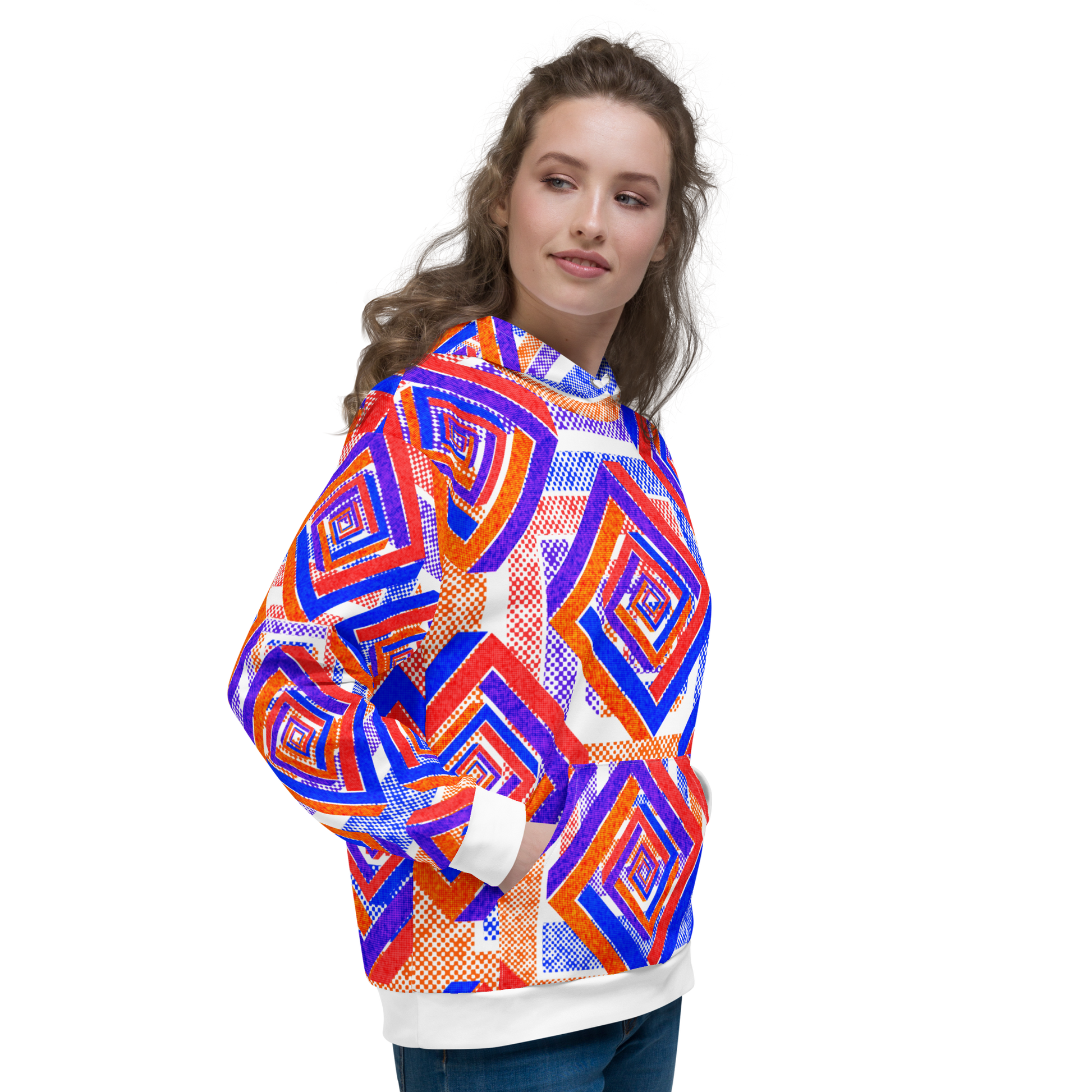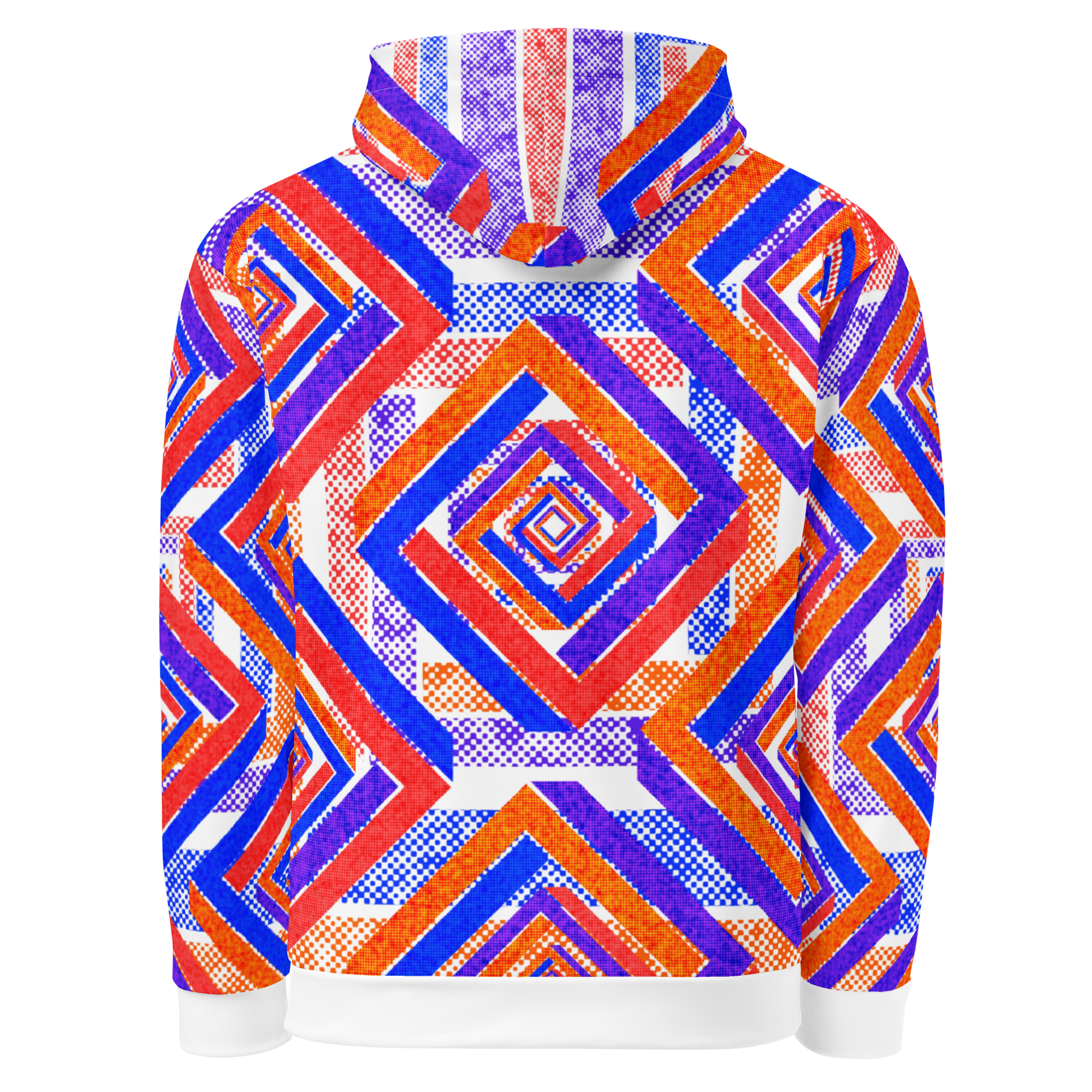 Penrose Square Evolved, now in recycled form. Same impossible geometry, amplified with the texture of the pixel grid and the heat of neon gradients. This hoodie looks like it crawled out of a malfunctioning simulation and decided to be comfortable anyway.